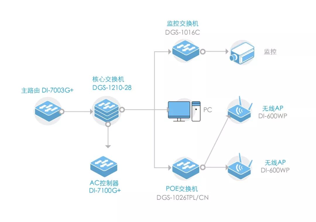 为此,D-Link部署了智简无线方案,DI-7000G+系列智简路由搭配DI-600WP吸顶式AP。当移动终端设备密集接入时不会不掉线,无线漫游不用手动重连,为用户提供畅快的上网体验。同时,这套方案管理很方便,可集中管控AP和实时查看用电设备使用功率情况。不仅使管理更高效,还节省了客户的维护成本,性价比非常高。