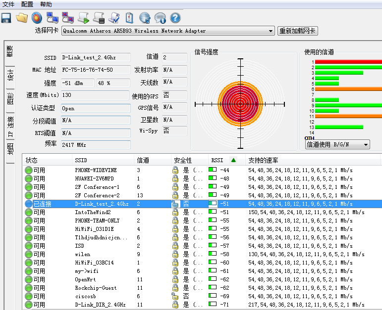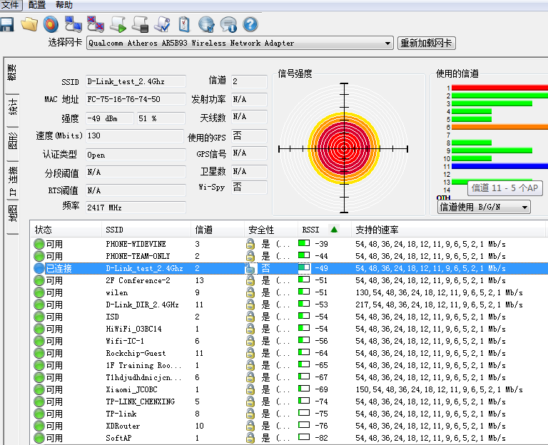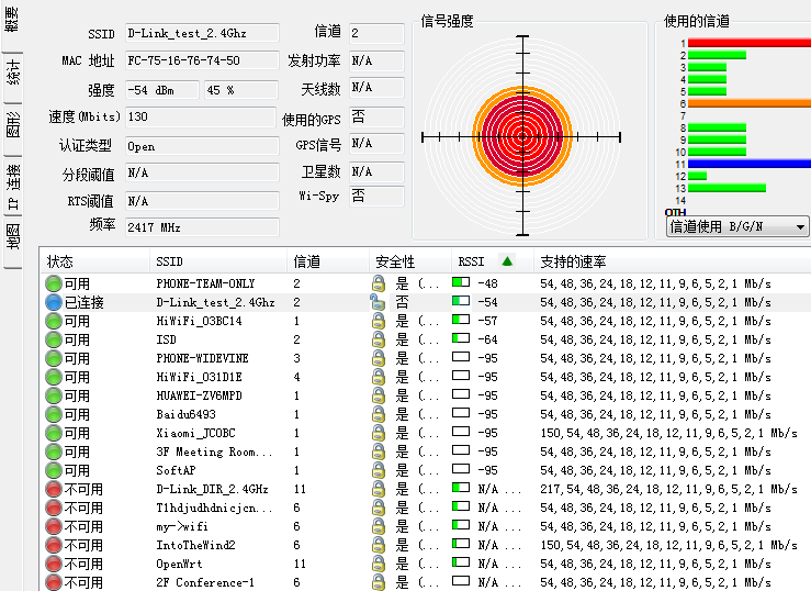在同一位置同一功率的情况下(无障碍物,距离10-11米,中间还有不少干扰),信号强度从强到弱依次为:D-Link、傲天动联、H3C、Cisco。(值数大于-dBm 70为达标,大约3格左右的信号)。